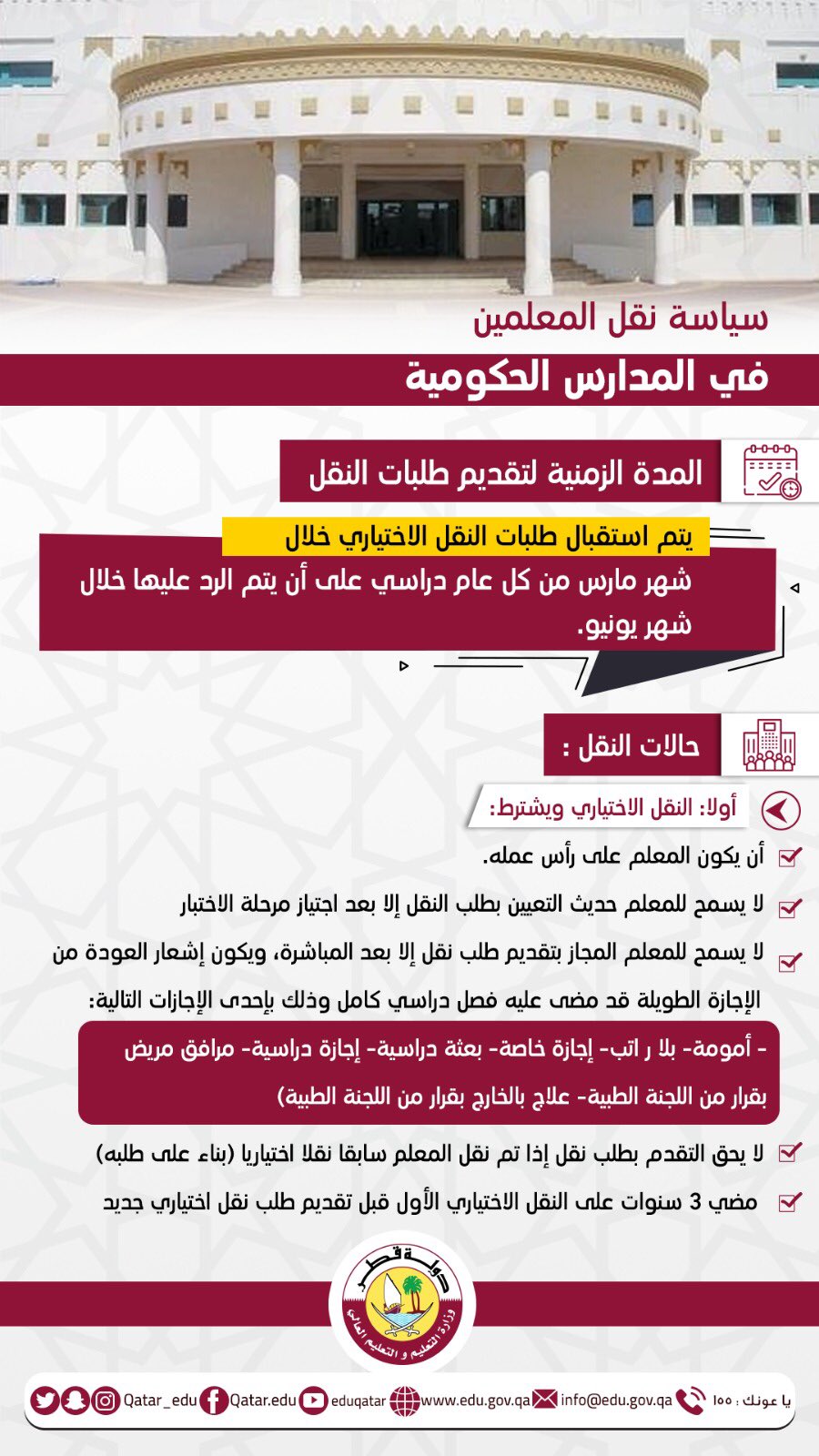 في عام 2002 صدر مرسوم بقانون إنشاء المجلس الأعلى للتعليم في قطر بصفته السلطة العليا المسؤولة عن رسم السياسة التعليمية بدولة قطر، وعن خطة تطوير التعليم والإشراف على تنفيذها أعقبه قانون. خطوات تقديم طلب توظيف في وزارة التربية والتعليم قطر. وزارة التعليم والتعليم العالي قطر خدمات الموظفين. تطبيق خدمات وزارة التعليم والتعليم العالي بدولة قطر keywords: ا لمهام التي يقوم بها قسم شؤون الموظفين. خريجي جامعة قطر كلية التربية. إن الدخول إلى أو استخدام موقع بوابة أولياء الأمور التعليمية لدى وزارة التعليم والتعليم العالي في قطر (eduservices.edu.gov.qa) له شروط وحالات وملاحظات مبينة أدناه في (الاحكام والشروط). مناهج وزارة التربية سورية 2021 الكتب و دليل المعلم. May 06, 2021 · الوظيفة مخصصة للقطريين ذكور وإناث. Ta3leem, qatar, ta3leem qatar, the ministry of education and higher education نظام التعليم الخطة الاستراتيجية لوزارة التعليم والتعليم العالي 2018 2022 الإحصائيات و التقارير السنوية. عرض المزيد من قائمة البرامج و المشاريع المزيد من الأخبار. مناهج وزارة التربية والتعليم الإمارات 2021